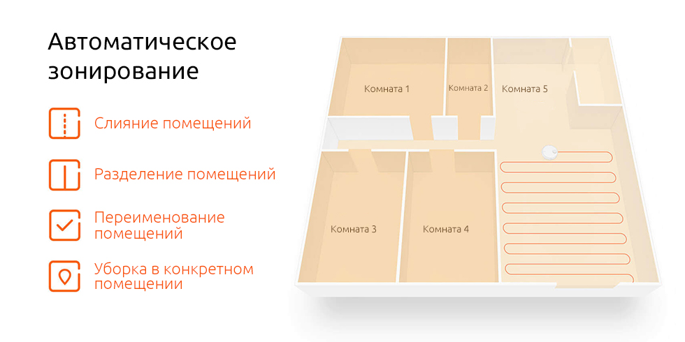 После окончания первой уборки умный пылесос Xiaomi распознает помещения и автоматически разбивает их на комнаты по типам. Вы же можете разбивать помещения, соединять или переименовывать их, чтобы потом было проще управлять пылесосом.