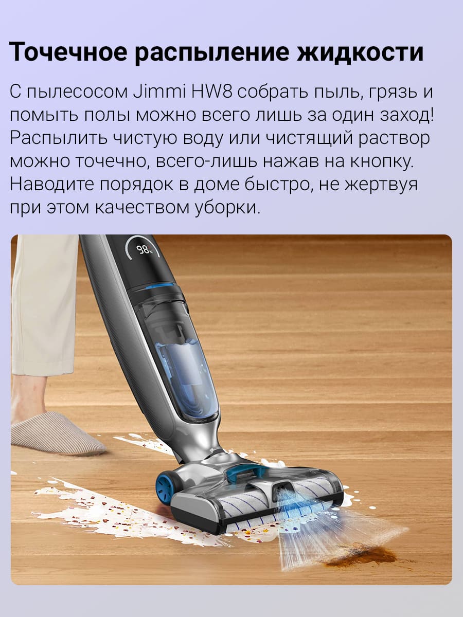 Jimmy HW8 обладает мощной очисткой и всасыванием, чтобы легко справиться с жесткими, застрявшими беспорядками или повседневными проблемами уборки пола. Технология точного распыления воды: пылесос оснащен визуальным внешним выходом для распыления воды с одной кнопкой, чтобы легко распылять воду и контролировать её количество. Удаляет все типы грязи с различных поверхностей. Не оставляет разводов!