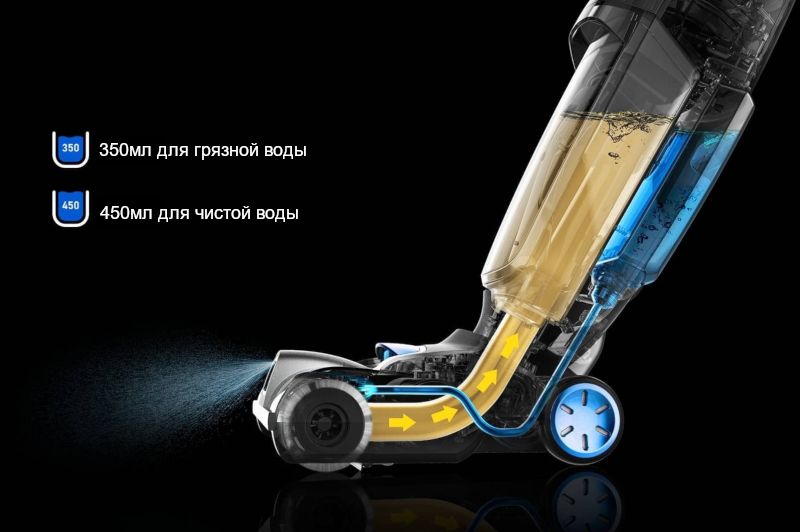Технология двойного бака позволяет не смешивать чистую и грязную воду, чтобы постоянно мыть пол только чистой водой.