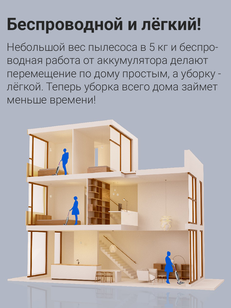 Легкая беспроводная конструкция позволяет свободно управлять пылесосом. Убирайте каждый уголок дома удобно.